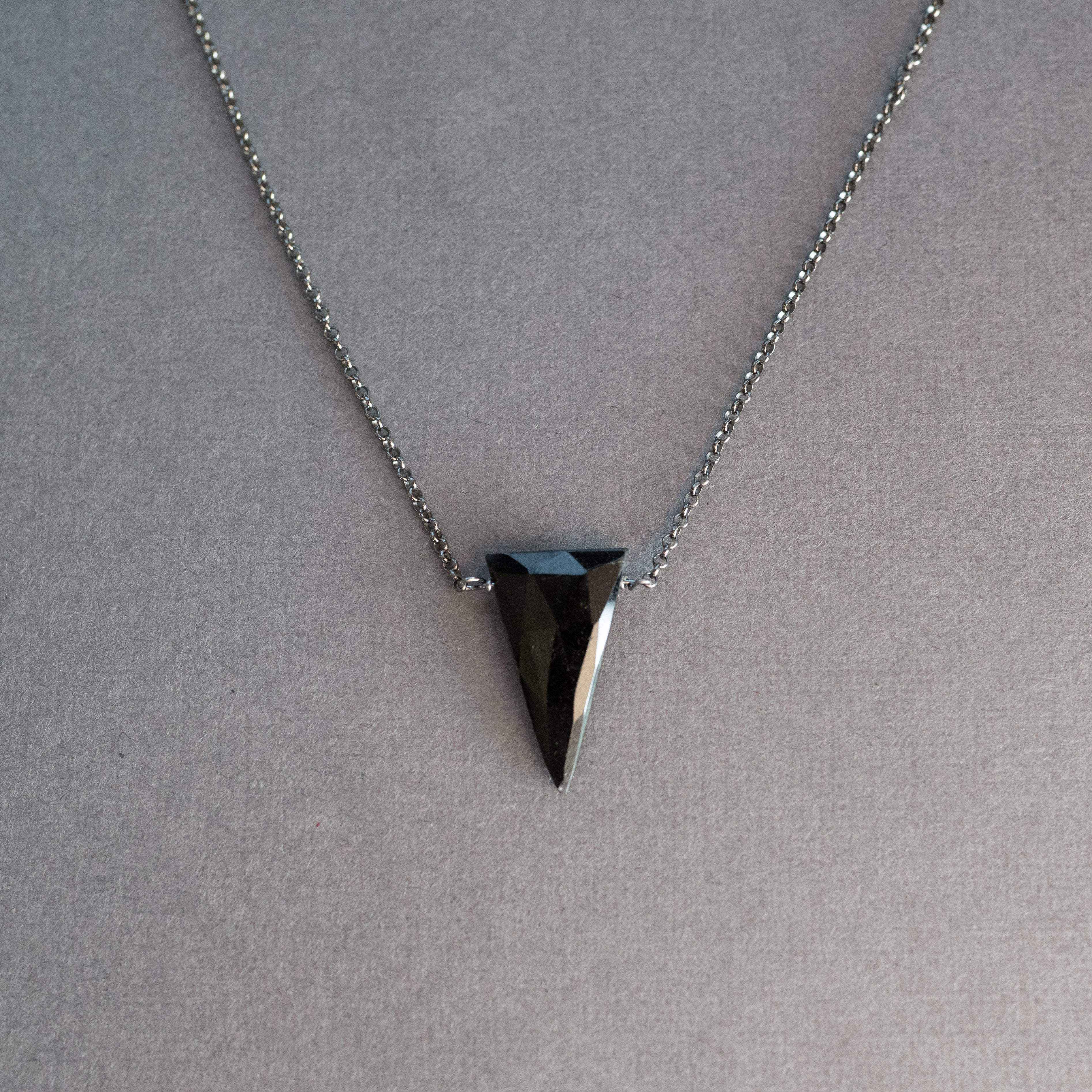 Hand cut black tourmaline faceted triangles on oxidized Sterling silver chain. 18”-20” adjustable. Stone is just under an inch.